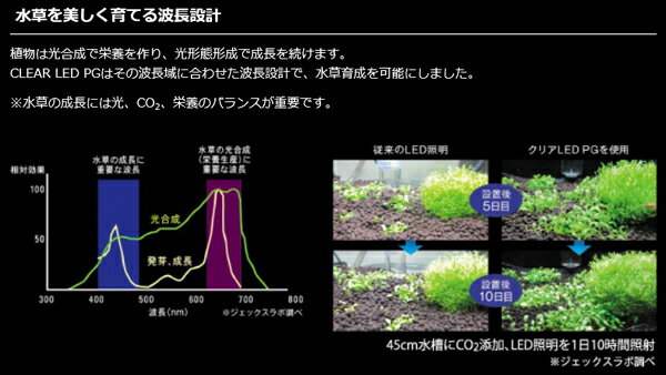 クリアLED PGは独自の波長光で特に育成の難しい水草を育て、さらに人の目に美しく映る波長域も十分に カバー。